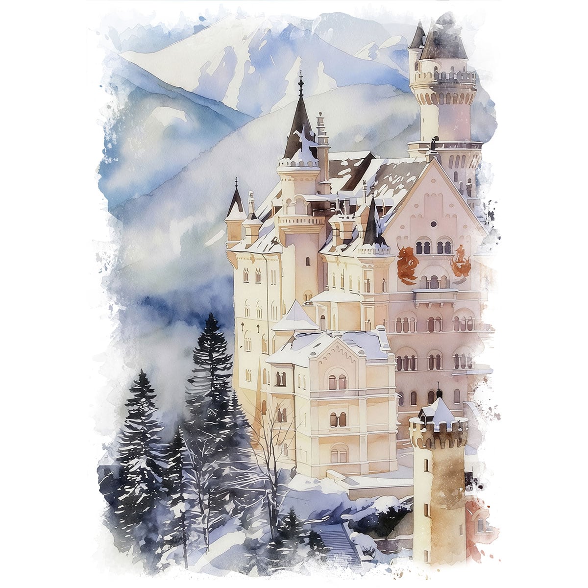 絵画 風景画(街並み) 冬 ドイツ 雪のノイシュバンシュタイン城 インテリアアート額付き 水彩画・油絵風 WAT1039