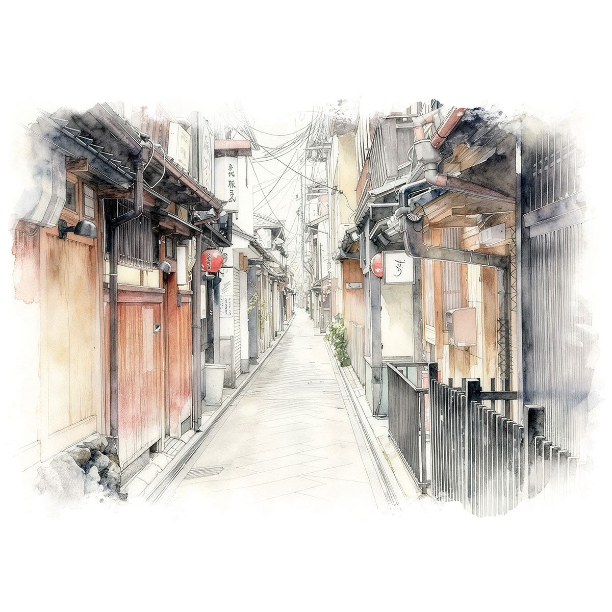 絵画 風景画(街並み) 日本 京都府 先斗町(ぽんとちょう)通り インテリアアート額付き 水彩画・油絵風 WAT1446