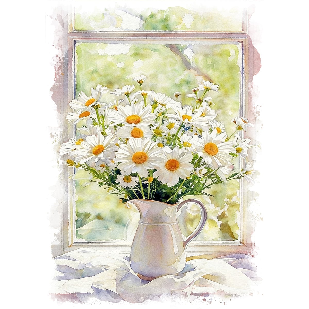 マーガレットは、清楚で可憐な白い花びらと中央の鮮やかな黄色が特徴の多年草です。花言葉に「真実の愛」や「信頼」を持ち、その純真な佇まいは古くから多くの人に愛されてきました。水彩画として部屋に飾るのがおすすめな理由は、その繊細な透明感にあります。水彩特有の柔らかなにじみや淡い色彩は、マーガレットの持つ優しさを最大限に引き出し、空間に穏やかな明るさと清潔感をもたらしてくれます。主張しすぎない控えめな美しさは、どんなインテリアにも馴染みやすく、見る人の心をそっと癒やす「心の安らぎ」として日常に彩りを添えてくれるでしょう。