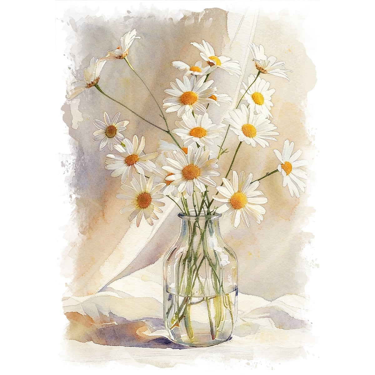 マーガレットは、清楚で可憐な白い花びらと中央の鮮やかな黄色が特徴の多年草です。花言葉に「真実の愛」や「信頼」を持ち、その純真な佇まいは古くから多くの人に愛されてきました。水彩画として部屋に飾るのがおすすめな理由は、その繊細な透明感にあります。水彩特有の柔らかなにじみや淡い色彩は、マーガレットの持つ優しさを最大限に引き出し、空間に穏やかな明るさと清潔感をもたらしてくれます。主張しすぎない控えめな美しさは、どんなインテリアにも馴染みやすく、見る人の心をそっと癒やす「心の安らぎ」として日常に彩りを添えてくれるでしょう。