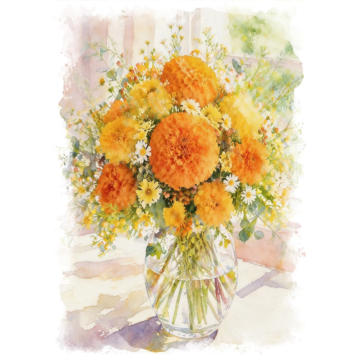太陽を象徴するような鮮やかな黄色やオレンジ色が特徴のマリーゴールドは、「健康」や「変わらぬ愛」という力強くポジティブな花言葉を持っています。その生命力あふれる姿は、見る人に活力と安心感を与えてくれます。パッと目を引くビタミンカラーがインテリアの明るいアクセントになり、日々の暮らしに元気を添えてくれるでしょう。
