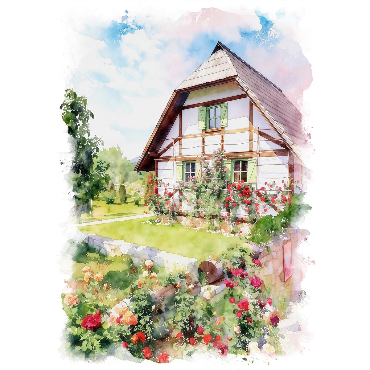 絵画 ボスニア・ヘルツェゴビナ 緑の木と花に囲まれた家の風景画 インテリアアート額付き 水彩画・油絵風 WAT0016