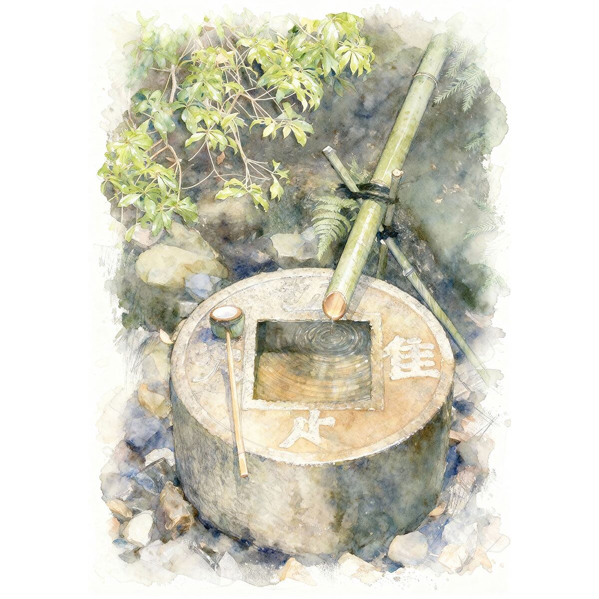 京都の龍安寺にある銭形手水鉢は、中央に四角い穴を持つ独特の造形をしています。四角い穴の周りに「吾唯知足(われただたるをしる)」という文字が彫られており、「知足(たるをしる)」という禅の教えを象徴しています。この手水鉢は、水を使うたびに自身の満ち足りた心を見つめ直すきっかけを提供します。石の円形部分と中央の正方形がデザインの調和を表し、静けさと調和を感じさせるこの場所で多くの観光客を引きつけます。