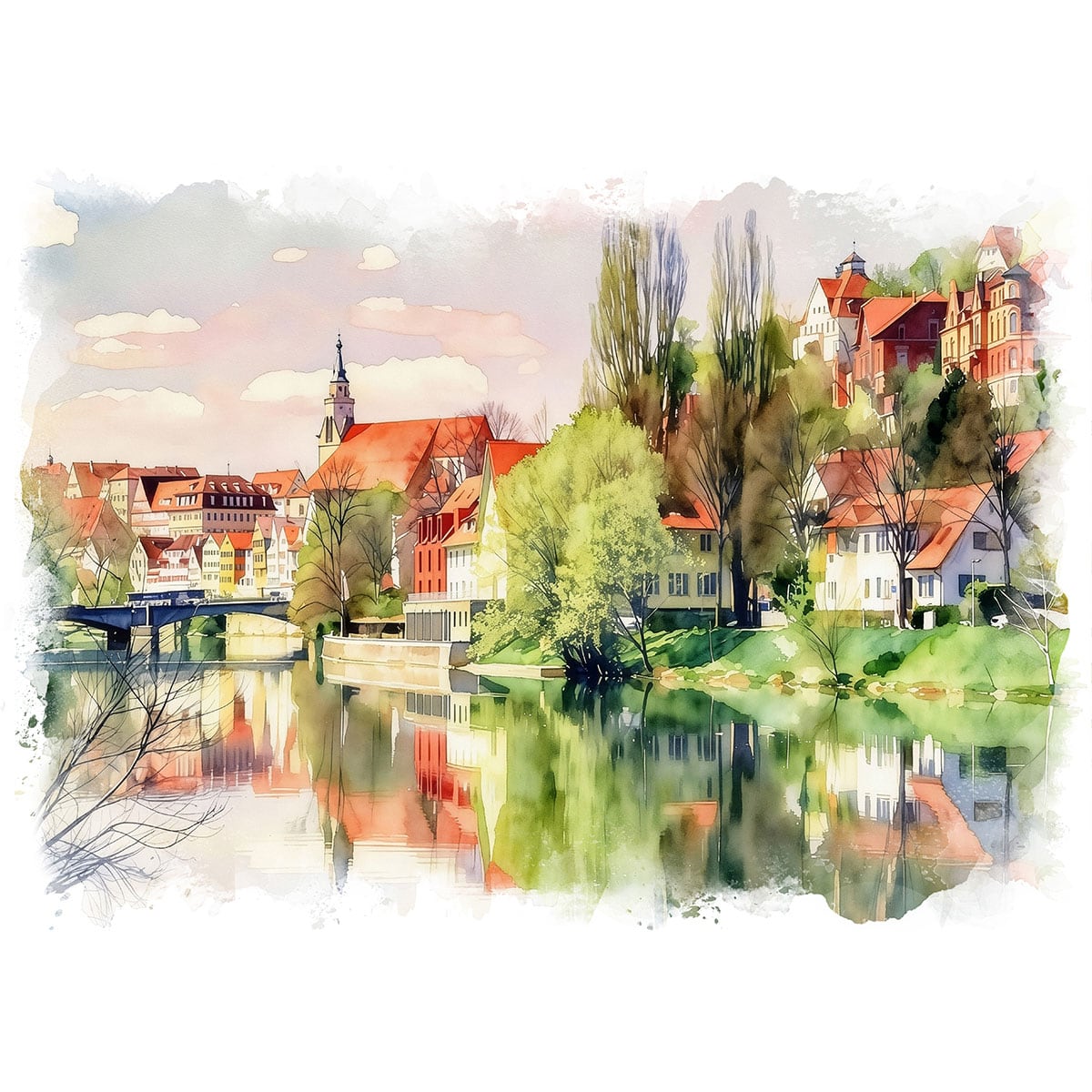 絵画 ドイツ 風景画(街並み) テュービンゲン インテリアアート額付き 水彩画・油絵調 WAT0253