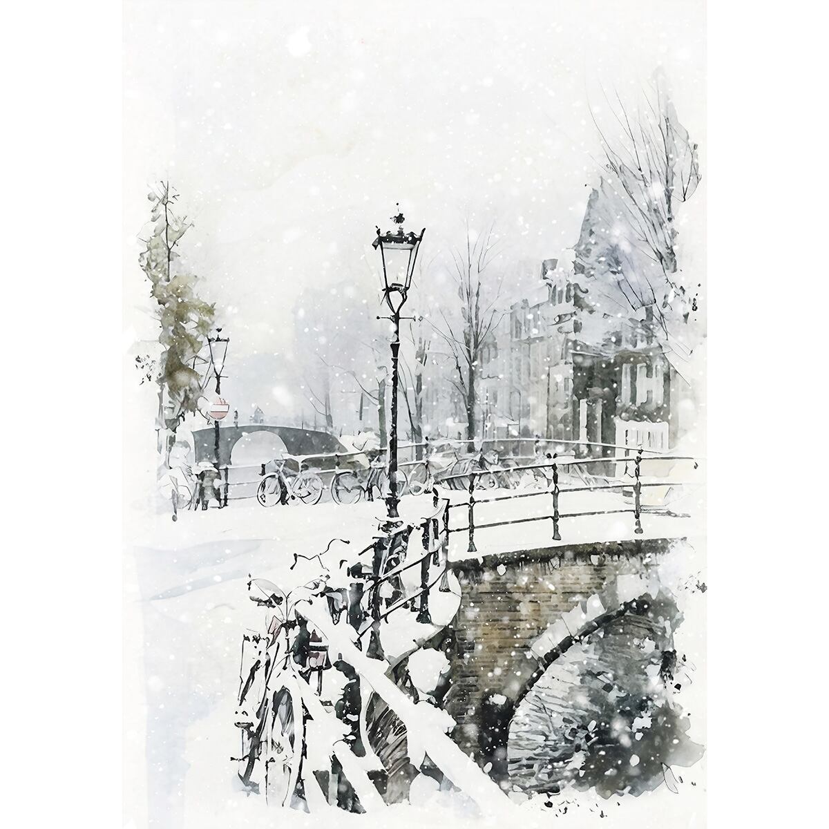 絵画 オランダ 風景画(街並み) 雪が積もる冬のアムステルダム インテリアアート額付き 水彩画・油絵調 WAT0276
