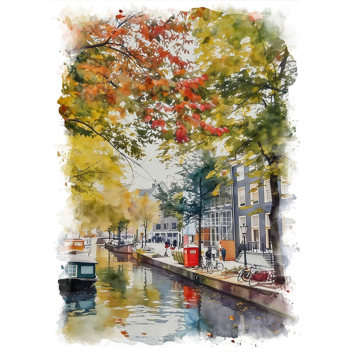 絵画 オランダ 風景画(街並み) ユトレヒトの秋と紅葉 インテリアアート額付き 水彩画・油絵調 WAT0307