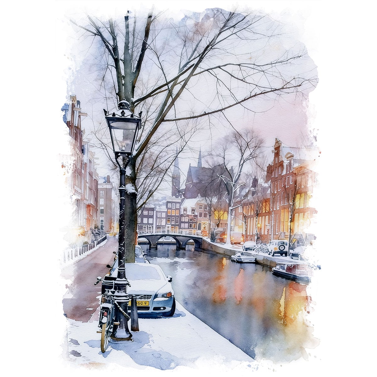 絵画 風景画(街並み) 冬 雪のオランダ アムステルダム インテリアアート額付き 水彩画・油絵調 WAT0525