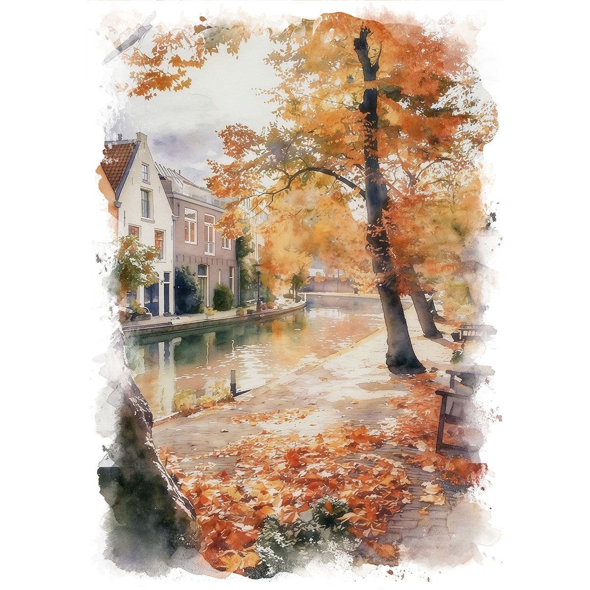 絵画 風景画(街並み) 秋 オランダ ユトレヒトの運河沿いの紅葉 インテリアアート額付き 水彩画・油絵調 WAT0532