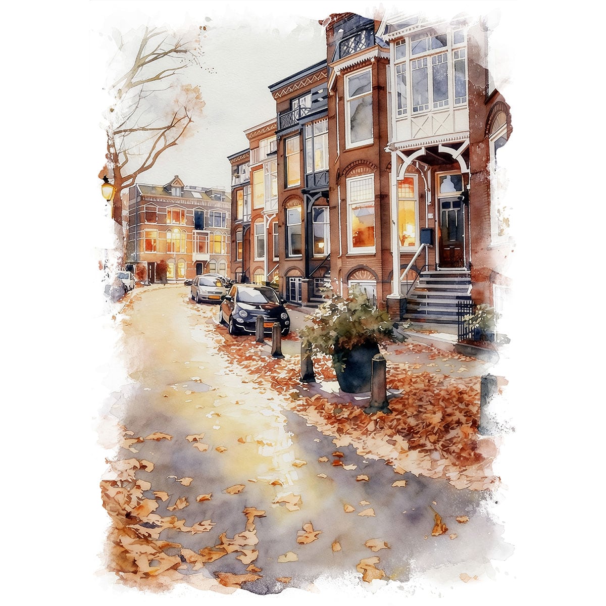 絵画 風景画(街並み) 秋 オランダ ユトレヒトの紅葉 インテリアアート額付き 水彩画・油絵調 WAT0533