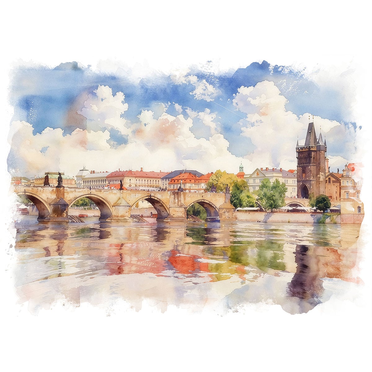 絵画 風景画(街並み) チェコ プラハ カレル橋 インテリアアート額付き 水彩画・油絵調 WAT0549