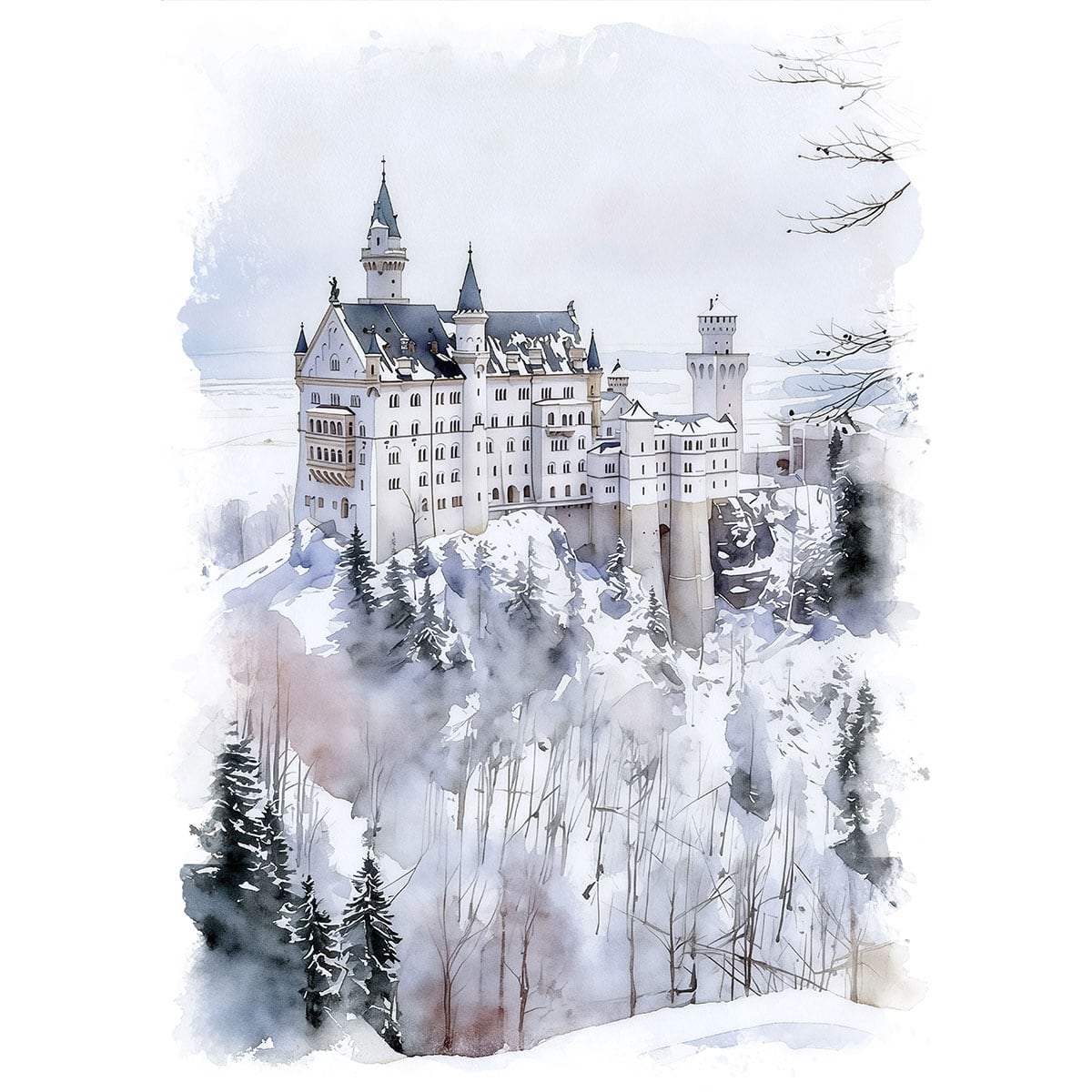 絵画 風景画(街並み) 冬 雪のドイツ ノイシュバンシュタイン城 インテリアアート額付き 水彩画・油絵調 WAT0588