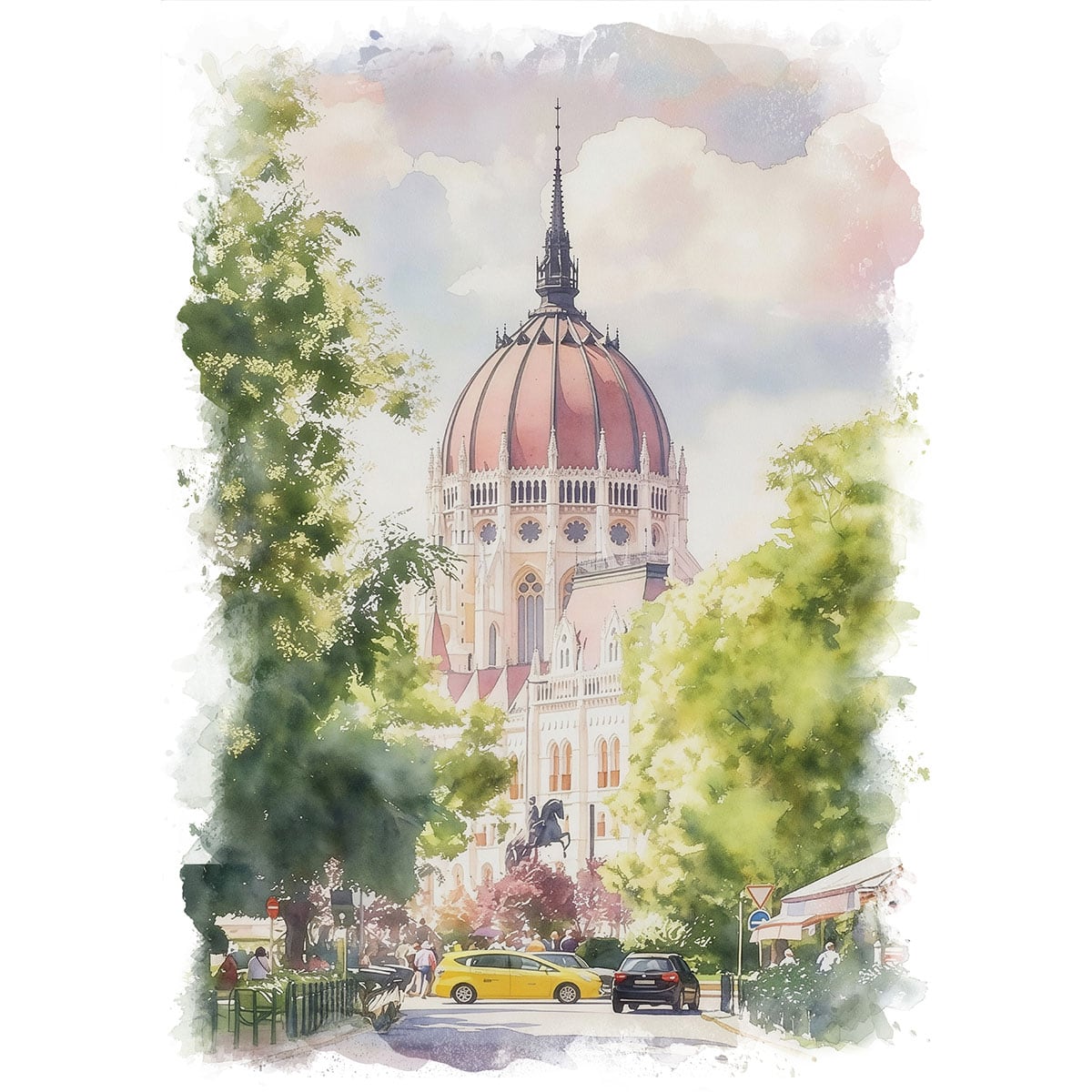 絵画 風景画(街並み) ハンガリー ブダペスト国会議事堂 インテリアアート額付き 水彩画・油絵調 WAT0591
