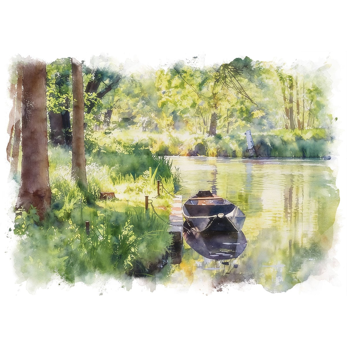 絵画 風景画(街並み) オランダ アムステルダム 川沿いの緑の木々 インテリアアート額付き 水彩画・油絵調 WAT0677