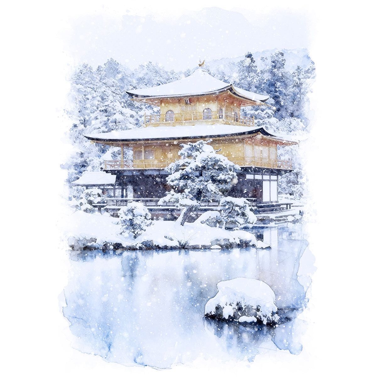 絵画(風景画) 日本 冬 雪が積もる金閣寺 インテリアアート額付き 水彩画・油絵風 WAT0790
