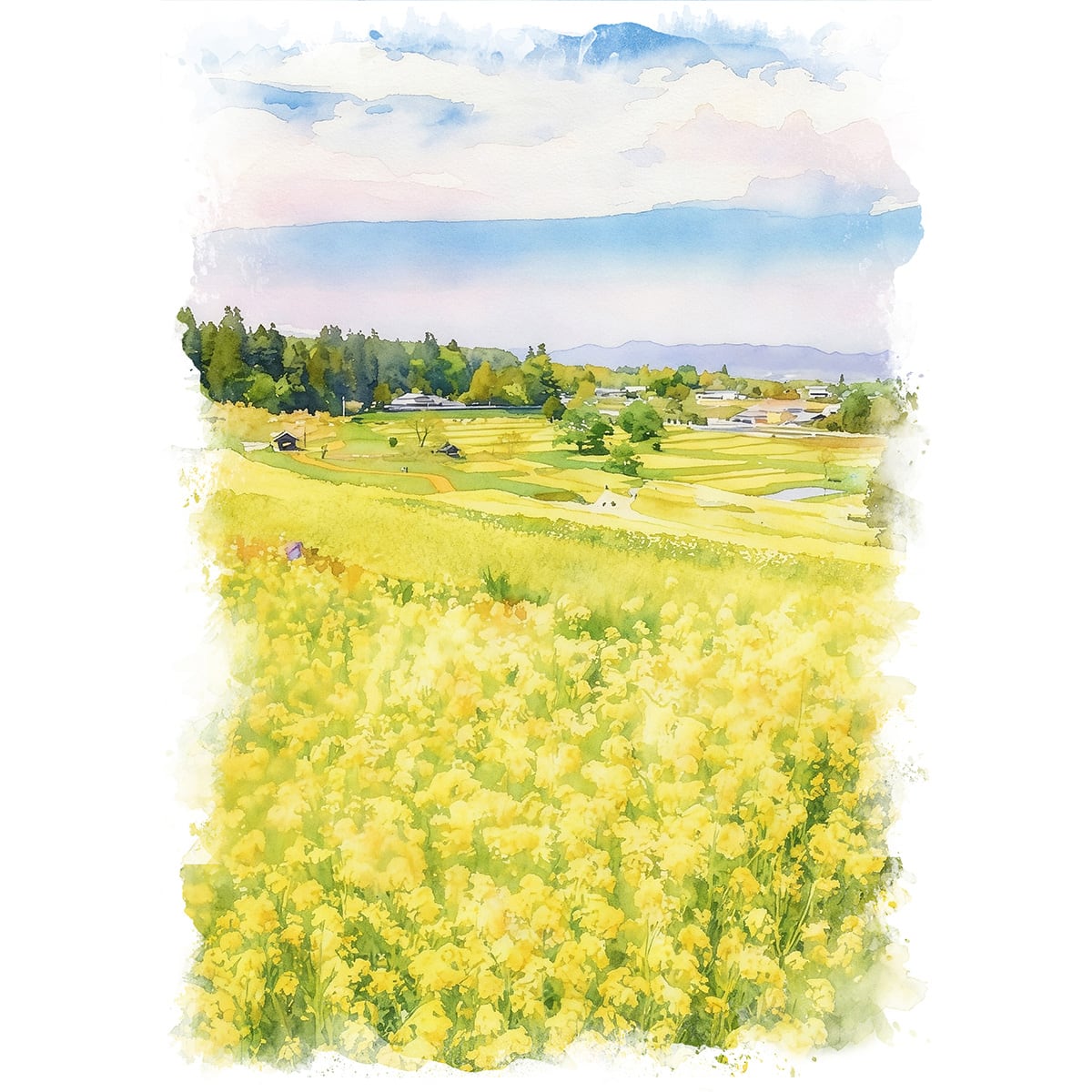 絵画(風景画) 日本の春 長野県 国営アルプスあづみの公園の菜の花畑 インテリアアート額付き 水彩画・油絵風 WAT0814