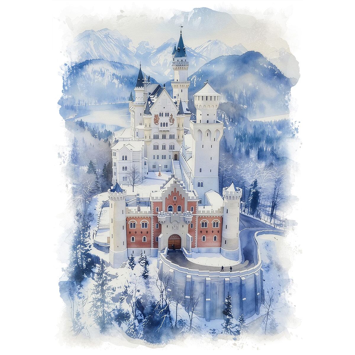 絵画(風景画) 冬 ドイツ 雪のノイシュヴァンシュタイン城 インテリアアート額付き 水彩画・油絵風 WAT0825