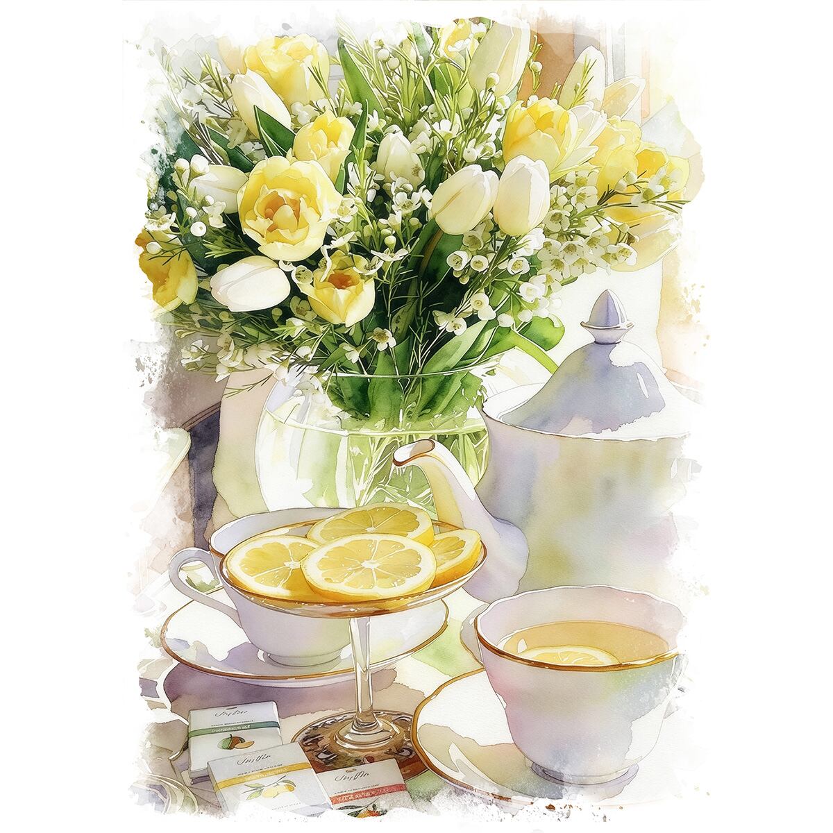 絵画 花(フラワー) 花瓶の花とティーカップ インテリアアート額付き 水彩画・油絵風 WAT0852