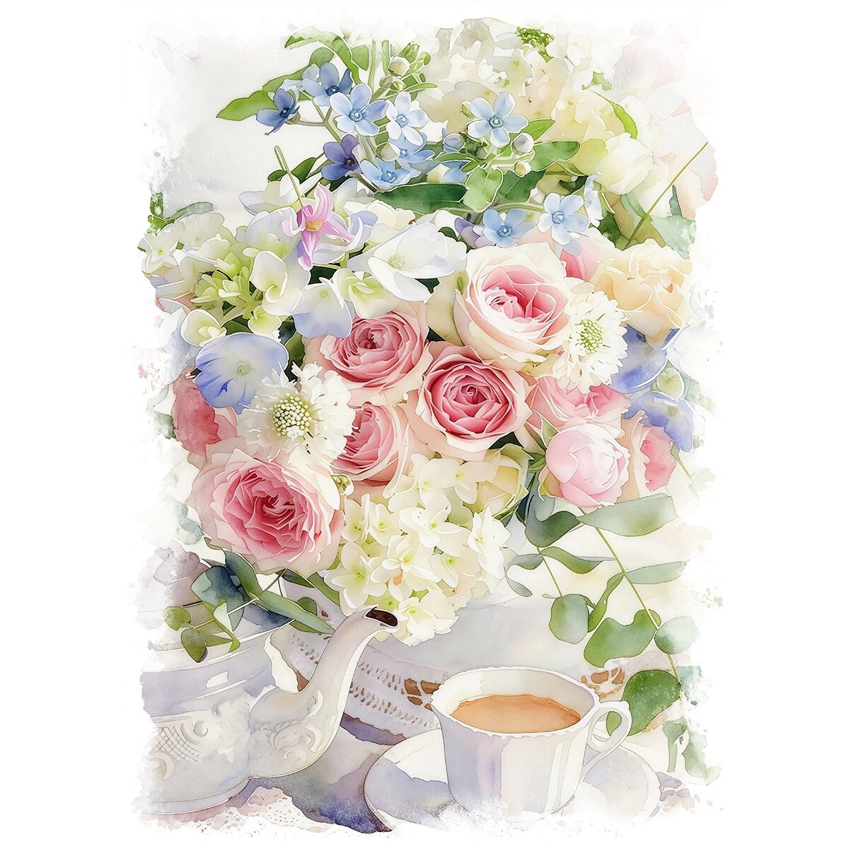 絵画 花(フラワー) 花瓶の花とティーカップ インテリアアート額付き 水彩画・油絵風 WAT0856