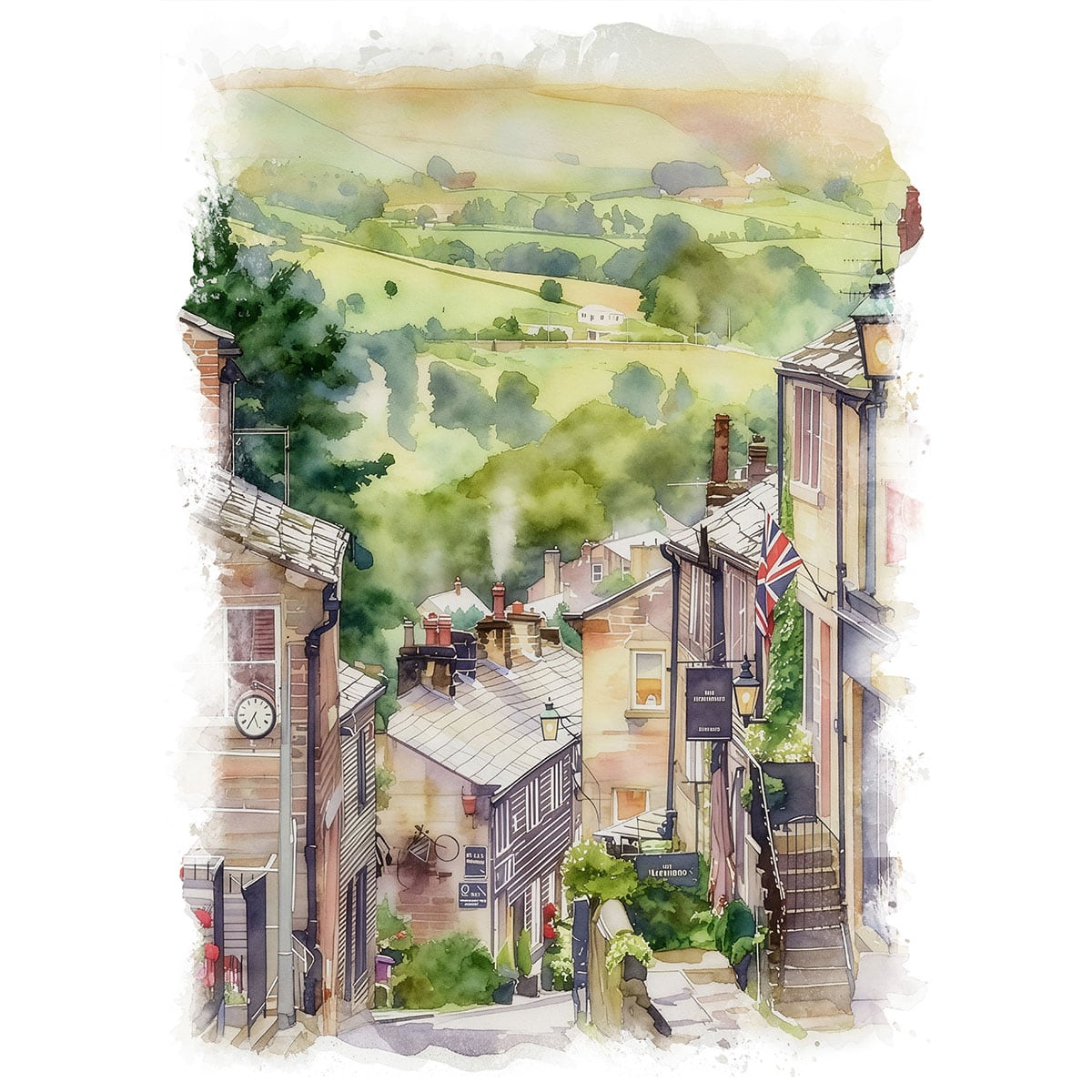 絵画 風景画(街並み) イギリス ヨークシャー ハワース インテリアアート額付き 水彩画・油絵風 WAT0879